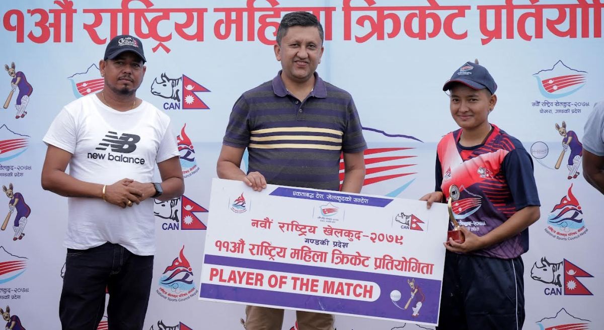 पुलिसका लागि सम्झना खड्काले २१ बलमा २ चौकाको मद्धतमा २५ रन बनाइन् । यसअघि काजल श्रेष्ठ र कविता कुँवरले पहिलो विकेटका लागि ३३ रनको साझेदारी गरे । कविता र काजल दुवैले समाज १६ रन बनाएका थिए । रेवती धामिले १४ रन बनाइन् । कर्णाली प्रदेशका लागि अन्जु गुरुङले ३ तथा बिना थापा र एञ्जिला क्षत्रीले समान १ विकेट लिए । खेलमा पुलिसका सम्झना खड्का प्लेयर अफ द म्याच भइन् ।