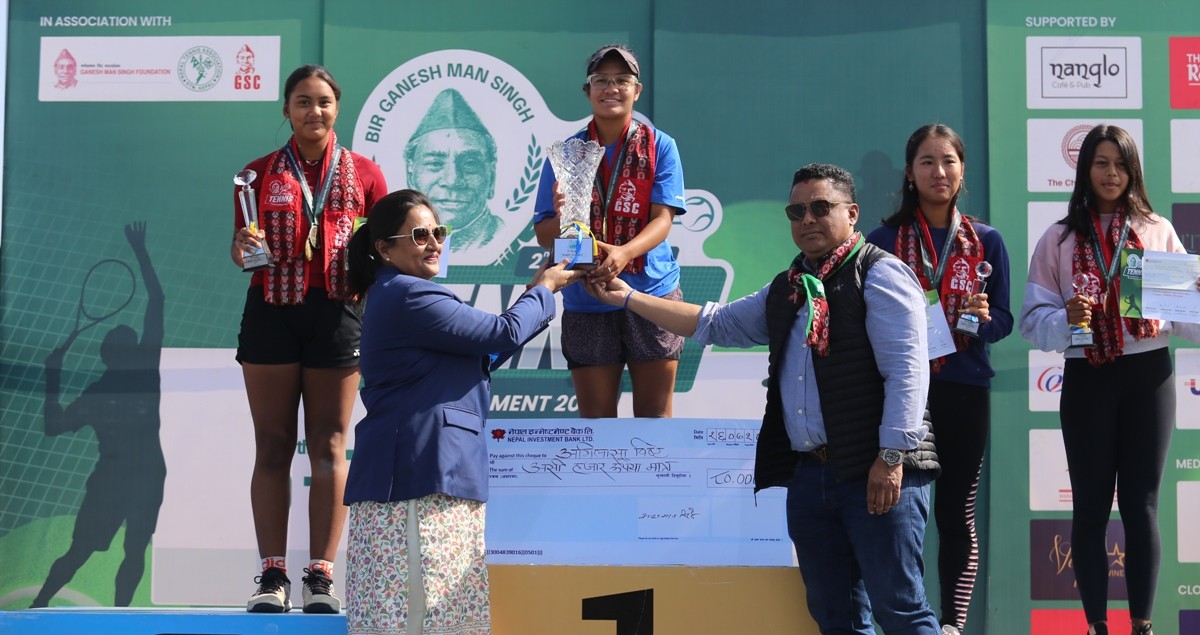 विजेता खेलाडीलाई प्रमुख अतिथि तथा नेपाली कांग्रेसका नेतृ सिर्जना सिंह, नेपाल लनटेनिस संघका अध्यक्ष तथा नेपाल ओलम्पिक कमिटिका उपाध्यक्ष ज्योति राणा, गणेशमान सिंह फाउण्डेशनका बोर्ड सदस्य तथा प्रतियोगिता संयोजक भाष्करमान सिंह, वीर गणेशमान सिंह स्पोर्ट्स कमिटिका संयोजक सन्जिब तुलाधर, कमिटिका सल्लाहकार राजिब श्रेष्ठ, राखेपको तालिम तथा प्रशिक्षण विभागका निर्देशक प्रचण्ड शर्मा, राखेपका बोर्ड सदस्य शैलेश कर्माचार्य लगायतले पुरस्कृत गरे ।