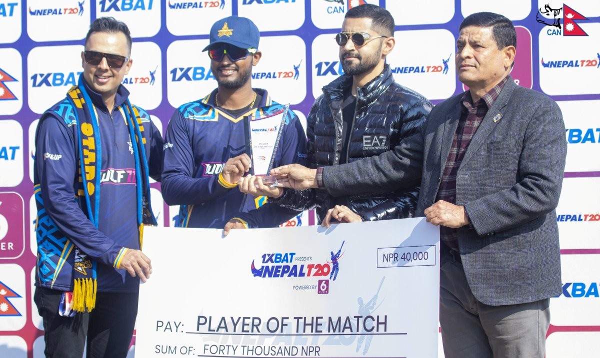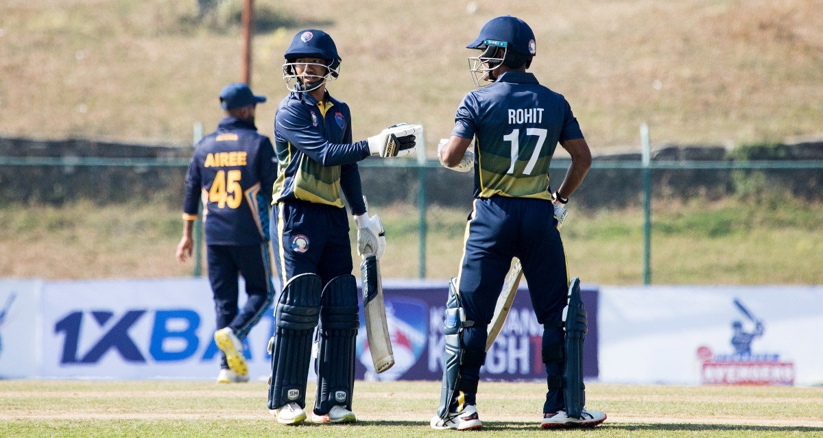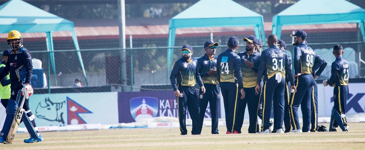 कुशल भुर्तेलले २६, कप्तान दीपेन्द्रसिंह ऐरीले १६ र विपुल शर्माले ११ रन बनाए । अनिल शाह ६ रनमा आउट भए । विराटनगरका लागि नन्दन यादव, हुसैन तलात, साहब आलम, सिकन्दर राजा र एन्ड्रे म्याककार्थीले समान एक/एक विकेट लिएका थिए ।