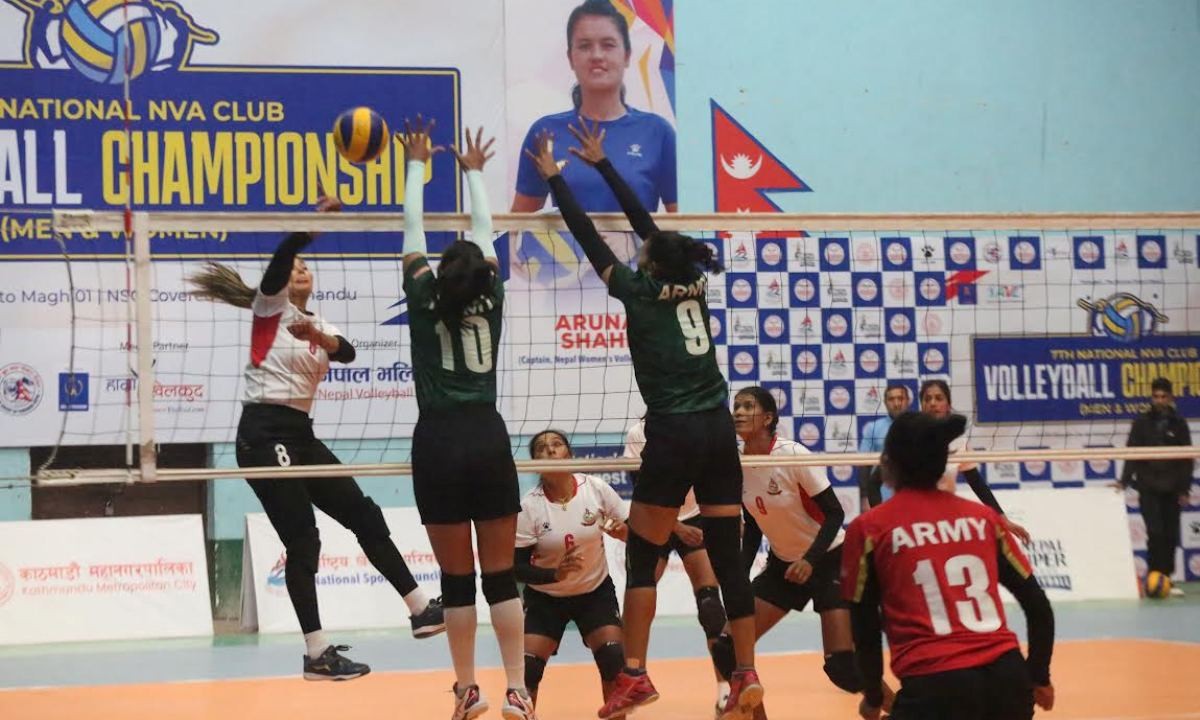 नेपाल भलिबल संघको आयोजनामा भएको च्याम्पियनसिपको महिला तर्फ पनि आर्मी समूह विजेता बन्दै सेमिफाईनल प्रवेश गरेको छ । समूह बी को आज भएको खेलमा आर्मीले एपिएफमाथि निकै रोमाञ्चक खेलमा ३–२ ले पराजित गर्दै समूह विजेता बन्दै सेमिफाईलमा स्थान पक्का गरेको हो ।