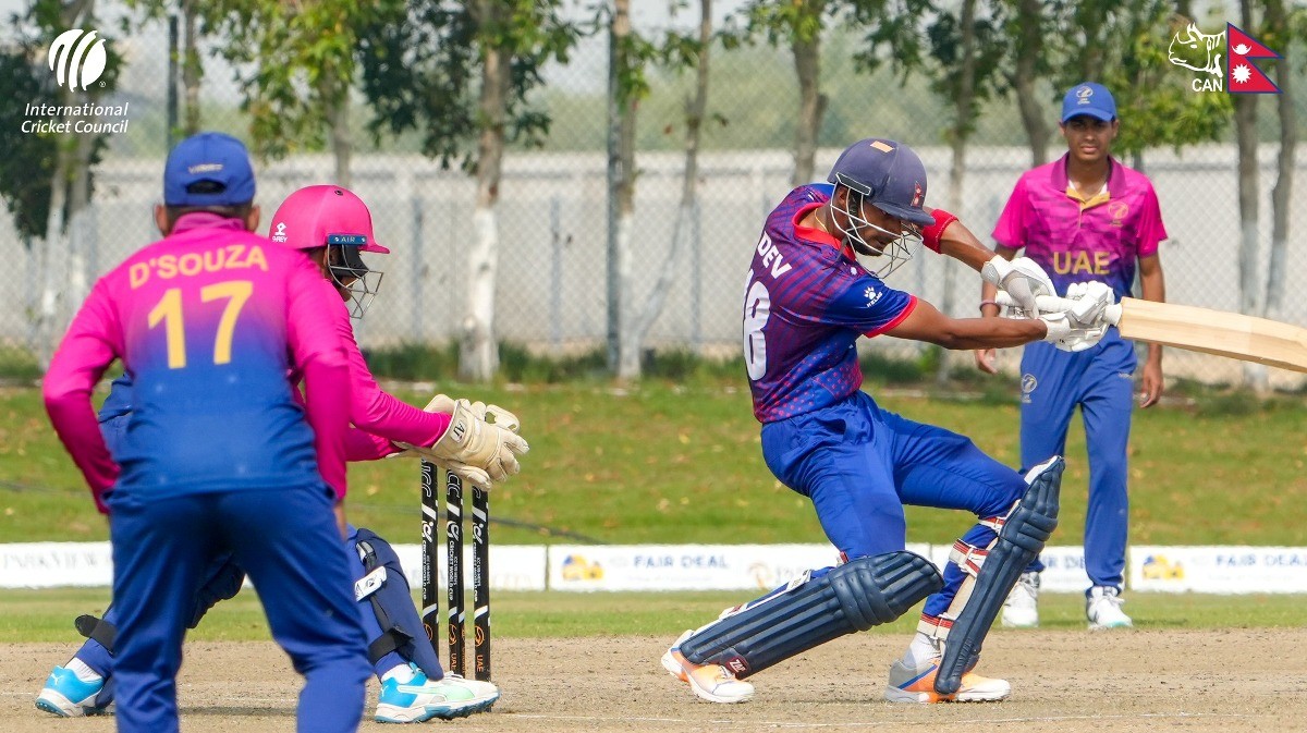 नेपालले जितको लागि दिएको १९२ रनको लक्ष्य पछ्याएको युएई ४८ ओभरमा सबै विकेट गुमाएर १८४ रनमात्र बनाउन सक्यो । युएईका लागि इथान काल्ल डी सोल्झाले ६६ बलमा ८ चौकासहित सर्वाधिक ५० रनको योगदान दिए । ओपनर अर्यान सक्सेनाले ६५ बलमा ५ चौकासहित ३४ रन बनाएका थिए । त्यस्तै, आर्यन शर्माले ३२ रन, अम्मर बदामीले १९ रन, ध्रुव पराशरले १७ रन र मारुफ १२ रनमा अविजित रहेका थिए ।