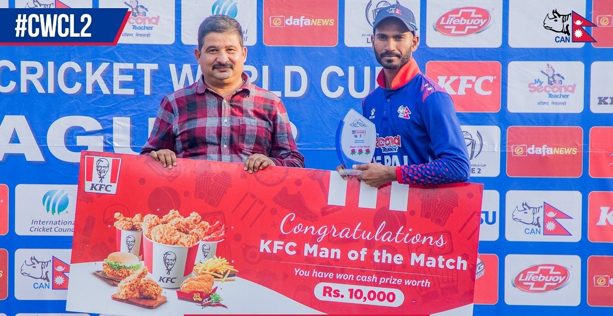 भीम सार्की ४४ रन बनाउँदा कप्तान रोहित पौडेलले ३० रन बनाए । आरिफ शेख १५ रनमा आउट हुँदा ज्ञानेन्द्र मल्लले ११ रन बनाएका थिए । करण केसीले ८ रन बनाउँदा दीपेन्द्र सिंह ऐरी र सन्दीप लामिछानेले ७/७ रन बनाए । सोमपाल कामी चार रनमा अविजित रहे ।