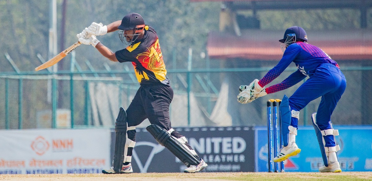 कुशल मल्ल १३ बलमा १ चौका र १ छक्कासहित १२ रनमा अविजित रहेका थिए । ओपनर कुशल भुर्तेल १४ बलमा ४ चौका र २ छक्कासहित ३३ रनमा आउट भए । पीएनजीका लागि चाड सोपरले एक विकेट लिए ।
