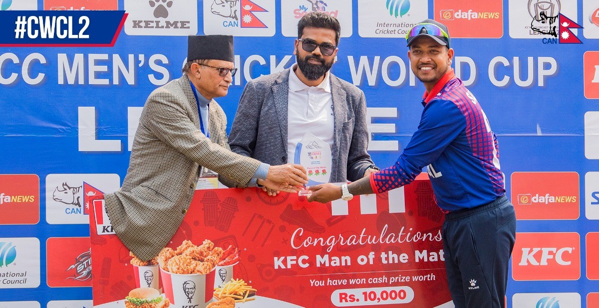 नेपालका लागि सन्दीप लामिछानेले १० ओभरमा १ मेडनसहित २५ रन खर्चेर ५ विकेट लिए । सन्दीपले एकदिवसीय क्रिकेटमा तेस्रोपटक एकै खेलमा पाँच विकेट लिएका हुन् । सन्दीप खेलको ‘प्लेयर अफ द म्याच’ भए । ललित नारायण राजवंशीले ७ ओभरमा १ मेडनसहित १३ रन खर्चेर २ विकेट लिए । कुशल मल्लले ३ ओभरमा १ मेडनसहित ६ रन खर्चेर २ विकेट लिए । सोमपाल कामीले एक विकट लिए ।