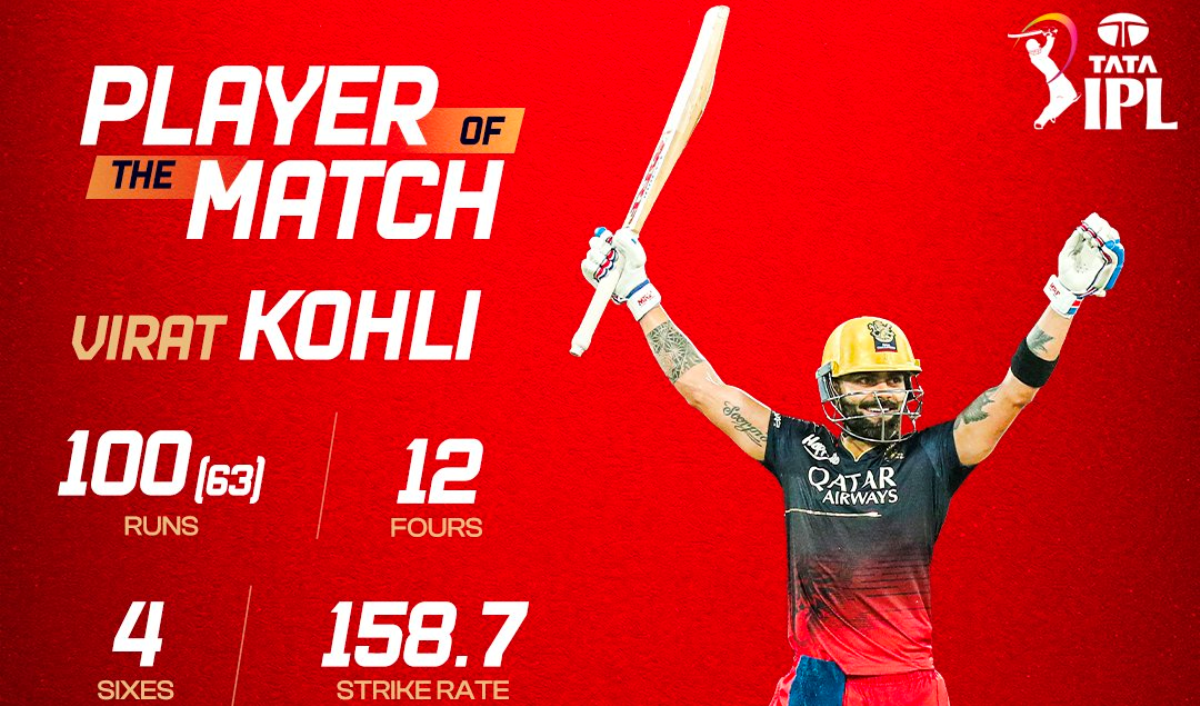 कोहली ६३ बलमा १२ चौका र ४ छक्कासहित १०० रन बनाएर आउट भएका थिए । कोहलीले आइपिएलमा बनाएको यो छैटौं शतक हो । कोहलीले आइपीएलमा क्रिस गेलले बनाएको ६ शतकको रेकर्डको बराबरी गरेका छन् । दिग्गज ब्याट्सम्यान कोहली खेलको प्लेयर अफ द म्याच बनेका थिए ।