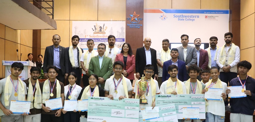 काठमाडौं । आयोजक साउथ वेस्टर्न स्टेट कलेजका पुरुषोत्तम सिलवालले प्रथम साउथ वेस्टर्न स्टेट अन्तरकलेज बुद्धिचाल प्रतियोगिताको उपाधि बुधबार जितेका छन् । बसुन्धरास्थित आयोजककै हातामा भएको नौ चरणको प्रतियोगितामा पुरुषोत्तमले ६.५ अंक जोडे ।
