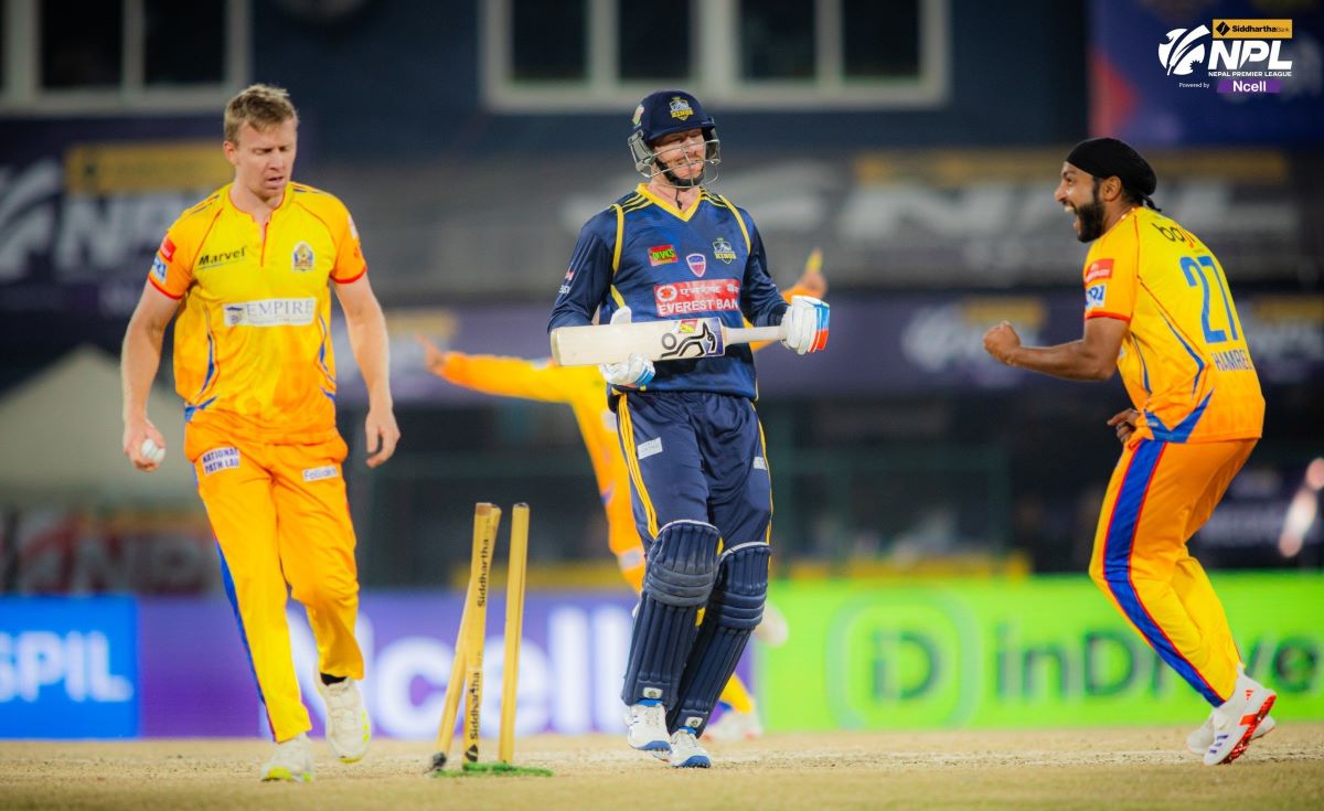मर्चेन्ट डे लाङ्गले १५ रन र बसिर अहमदले १२ रन बनाउँदा विराटनगरका अन्य ब्याटरले दोहोरो अंकमा रन बनाउन सकेनन् । साम हिजलेट र नरेन भट्टले खाता समेत खोल्न नसकी पभेलियन फर्किए भने मार्टिन गप्टिलले २ रन, लोकेश बमले ५ रन, नारायण जोशीले १ रन, प्रतिश जिसी र कप्तान सन्दीप लामिछाने समान ३ बनाएका थिए ।