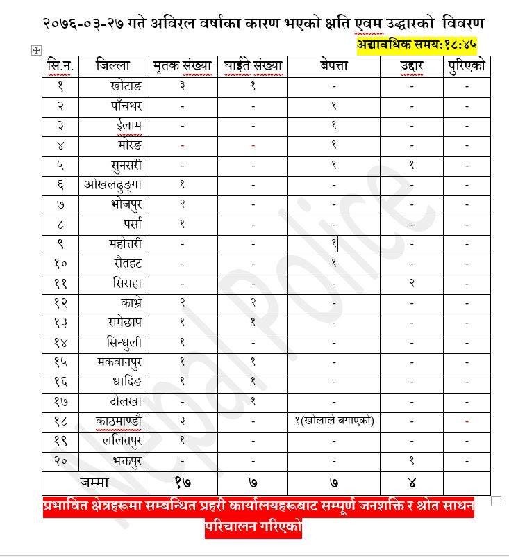 यसैबीच मकवानपुरमा पनि एक बालिकाको मृत्यु भएको छ । मृत्यु हुनेमा थाहा नगरपालिका–३ की बालिका सञ्चना बलामी रहेकी छन् । खोटाङमा तीन जना बेपत्ता छन् ।