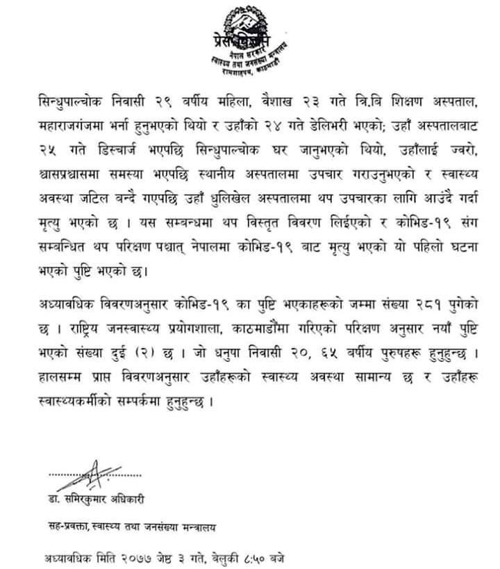 उनको १० दिनअघि त्रिवि शिक्षण अस्पतालमा नर्मल डेलिभरी भएको थियो । आमा छोरा दुबैको स्वास्थ्य सामान्य थियो र उनीहरू गत २५ गते डिस्चार्ज भएर घर फर्किएका थिए । तर उनलाई ज्वरो र खोकी लाग्नुका साथै स्वासप्रश्वासमा समस्या आयो । बाह्रबिसे प्राथमिक स्वास्थ्य केन्द्रमा उपचार गर्दा पनि निको नभएपछि धुलिखेल अस्पताल ल्याउने क्रममा बाटैमा उनको निधन भएको हो । कोरोनासँग मिल्दोजुल्दो लक्षण देखिएको बताएकाले उनको पीसीआर विधिबाट परीक्षण गर्दा रिपोर्ट पोजेटिभ आयो । राष्ट्रिय जनस्वास्थ्य प्रयोगशालामा गरिएको परीक्षणमा पनि उनको रिपोर्ट पोजेटिभ नै आएको छ । यद्यपि उनको मृत्यु कोरोनाकै कारण भएको घोषणा गर्नुपूर्व स्वास्थ्य तथा जनसंख्या मन्त्रालयले शनिबार नै अध्ययन टोली धुलिखेल अस्पतालमा पठाएको थियो । टोलीको रिपोर्टका आधारमा मन्त्रालयले उनको मृत्यु कोरोनाका कारण भएको घोषणा गरेको छ ।