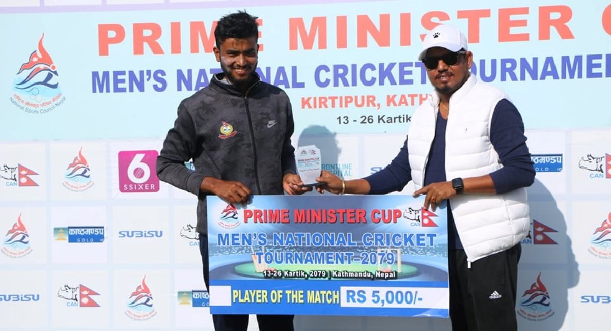 यस्तै प्रदिप ऐरीले ३३ रन जोड्दा आसिफ शेखले २५ रन बनाए । सुमित महर्जनले १३ रन जोड्दा सन्दीप जोरा ६ रनमा अविजित रहे । बलिङ्गतर्फ मधेश प्रदेशका लागि रुपेश सिंहले २ तथा राजेश यादवले १ विकेट लिए ।