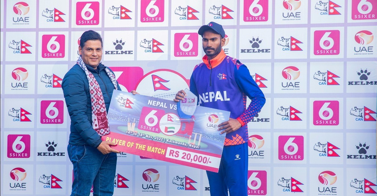 कप्तान रोहित पौडेल १० रनमा आउट भए । ओपनर अर्जुन साउँद ९ रनमा आउट भएका थिए । दीपेन्द्र सिंह ऐरी सुन्य रनमा रन आउट भए । हरिशंकर साह सुन्य रनमा अविजित रहेका थिए । युएईका हजरत बिलाल र आयन अफजल खानले १/१ विकेट लिए । नेपालका आसिफ शेख प्लेयर अफ द म्याच चुनिएका छन् ।
