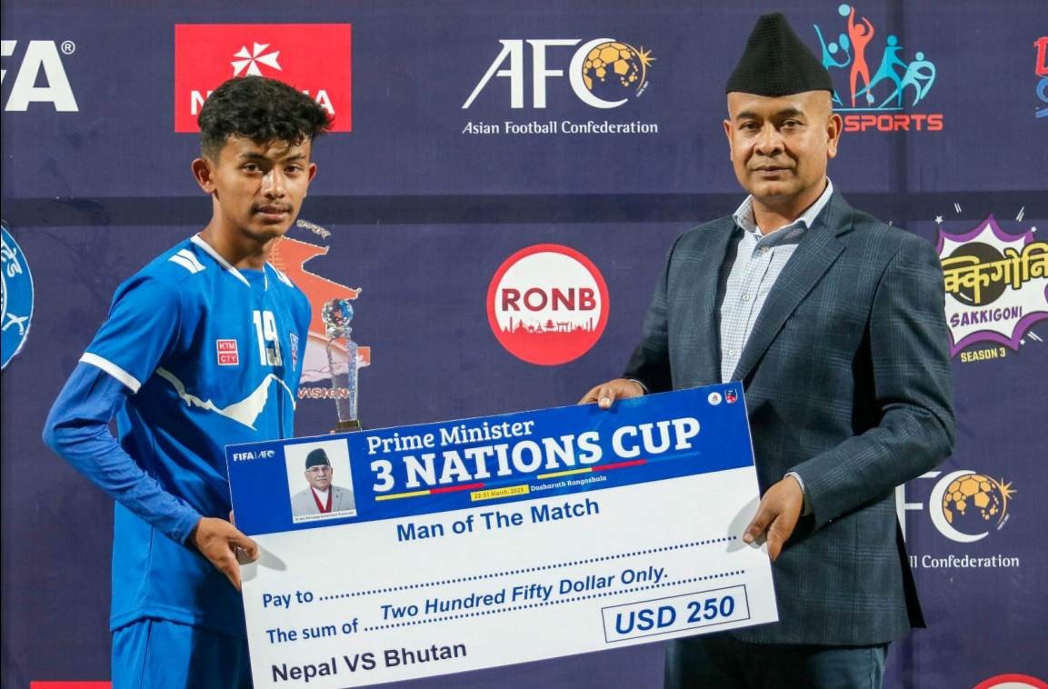खेलको ५० औं मिनेटमा भुटानका गोलरक्षक छिरिङ धेन्डुपसँग ठोकिँदा अञ्जन विष्ट घाइते हुँदै मैदानबाट बाहिरिएपछि दीपक मैदान छिरेका थिए । दीपकले लाओसविरुद्धको खेलबाट डेब्यु गरेका थिए । आयुष घलान खेलको खेलको 'म्यान अफ दि म्याच' चुनिए । भुटानविरुद्ध उच्च प्रदर्शन गरेका आयुषले अवार्डसहित २ सय ५० अमेरिकी डलर जितेका छन् ।