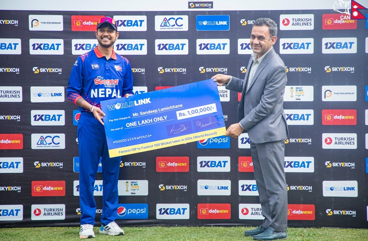 इन्टरनेट सेवा प्रदायक कम्पनी वर्ल्डलिंक कम्युनिकेशन्सले स्पिनर सन्दीप लामिछानेलाई १ लाख नगदसहित सम्मान गरेको छ । ओडिआईमा सबैभन्दा छिटो १ सय विकेट लिएकोकोमा बधाई दिँदै वर्ल्डलिंकले सन्दीपलाई सम्मान गरेको हो ।